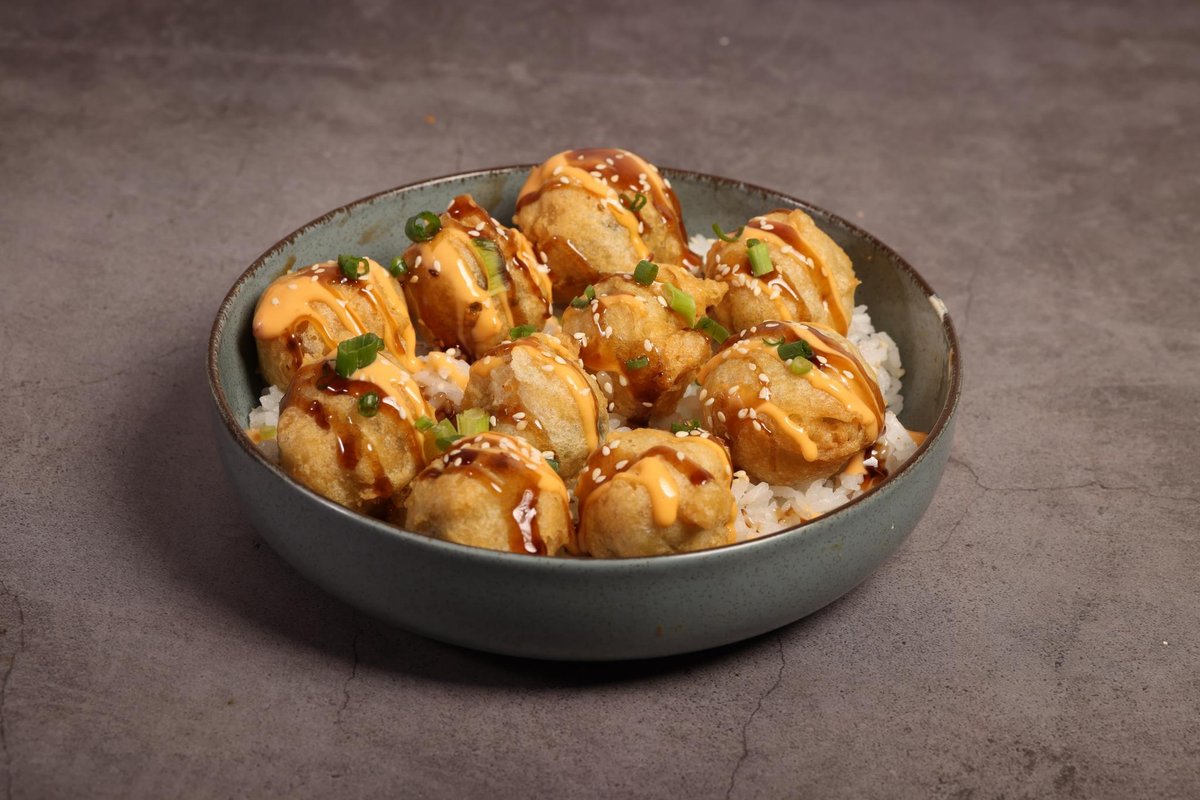כדורים של אורז, סלמון ונורי מטוגנים בטמפורה על ארוז עם ספייסי מיו, טריאקי, בצל ירוק ושומשום קלוי