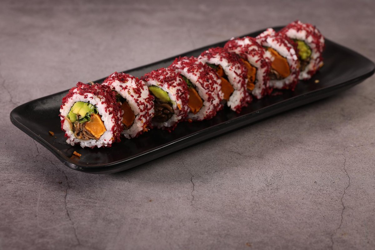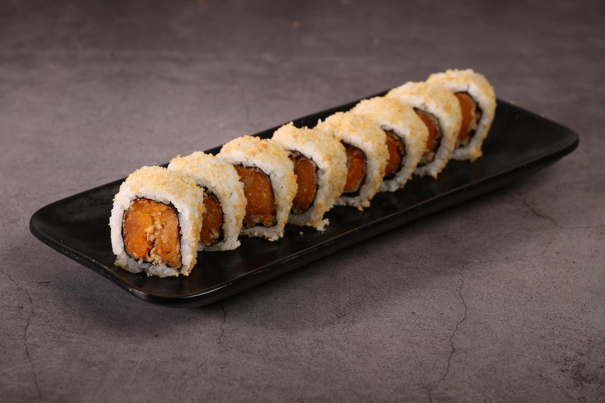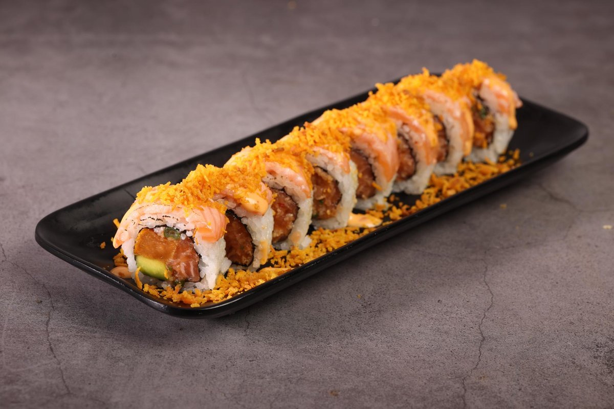 אורז לבן, מלפפון, אבוקדו, בטטה, פלפל חריף, פטריות חי, מיקס כרוב, ספייסי סלמון, קרנץ׳ טמפורה, שומשום ואצות נורי מעל, עם וואסאבי מיונייז, ספייסי מיו וסויה