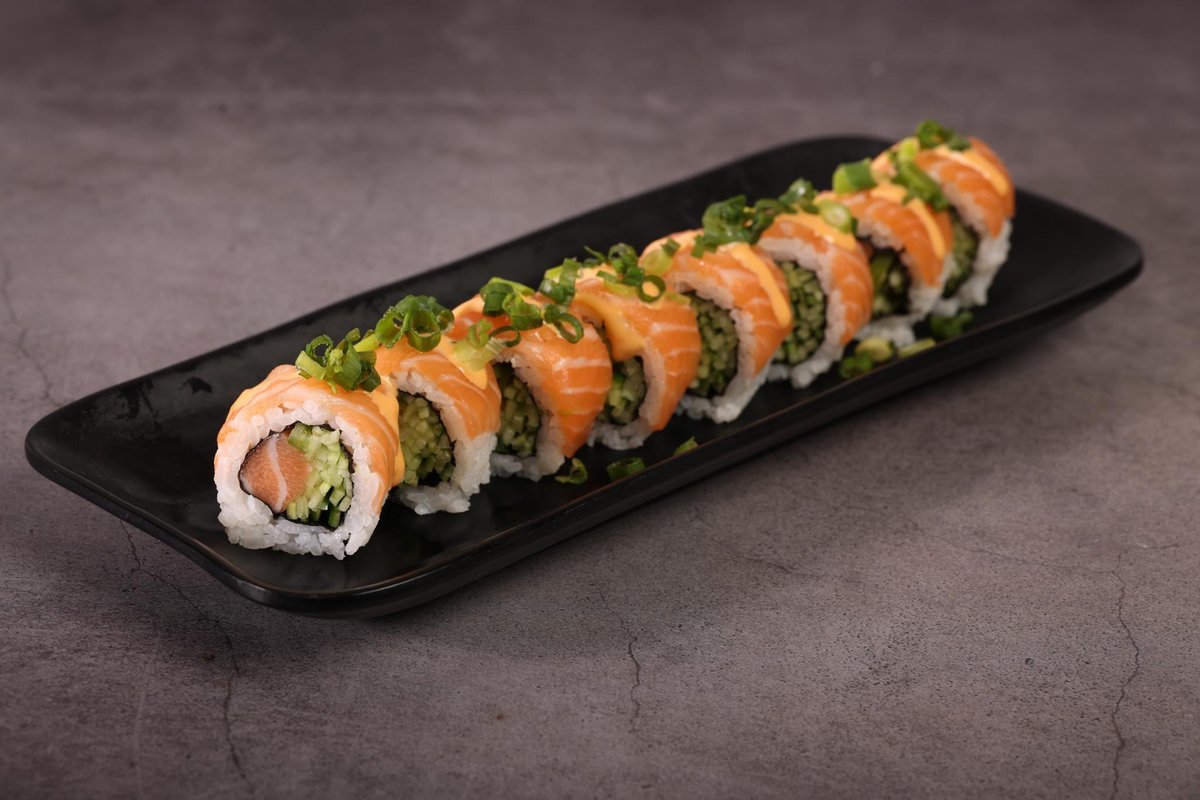 סלמון, מלפפון, פלפל חריף קצוץ, עטוף בסלמון נא, רוטב ספייסי מיו ובצל ירוק