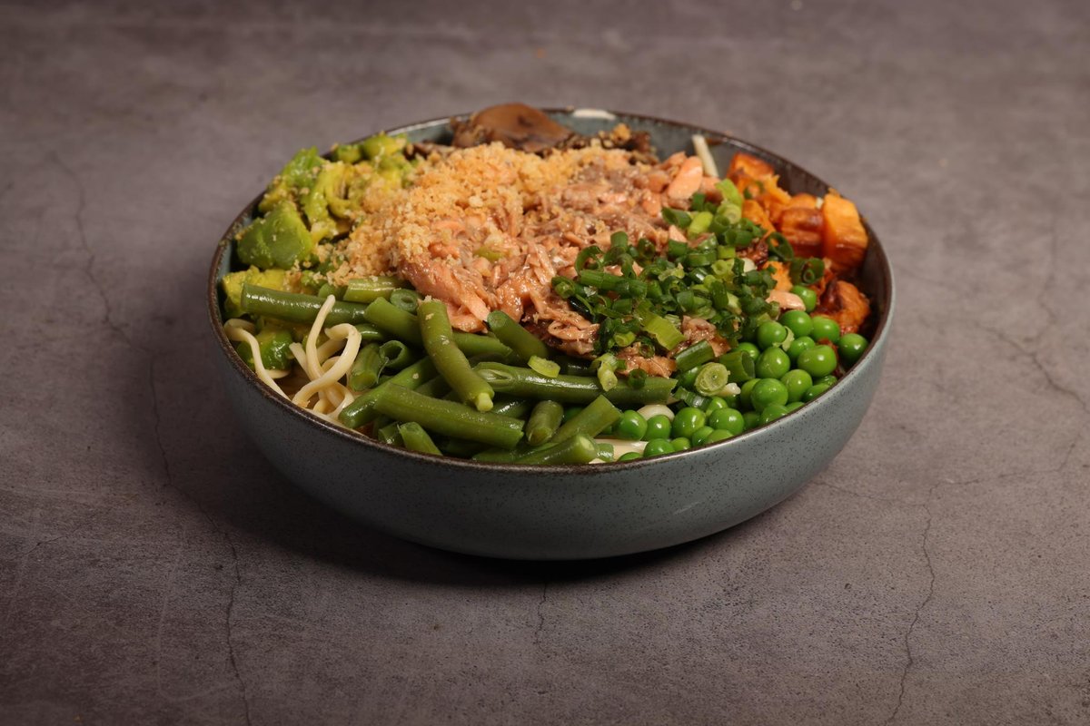 נודלס, אבוקדו, פטריות טריאקי, בטטה, אפונה, שעועית ירוקה, בצל ירוק, סלמון אפוי, קרנץ׳ מיקס, בוטנים וקשיו מעל, עם ספייסי מיו, רוטב הבית וקארי