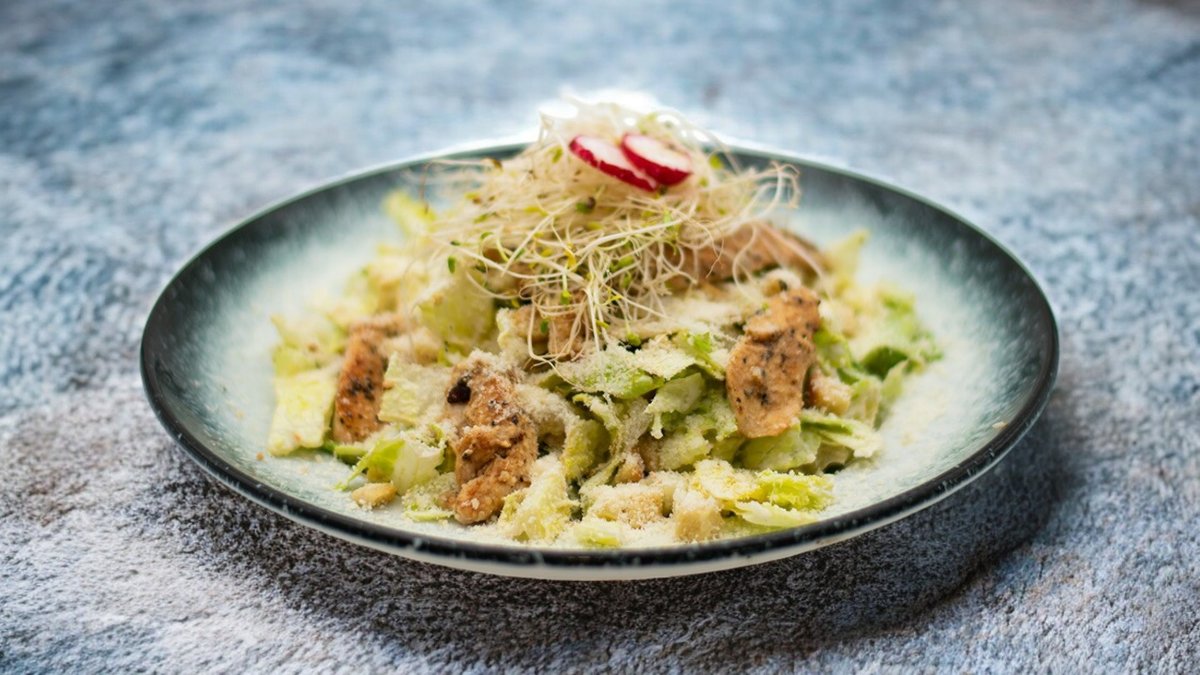 חסה, קרוטונים, גבינת פרמז׳ן ורוטב סיזר