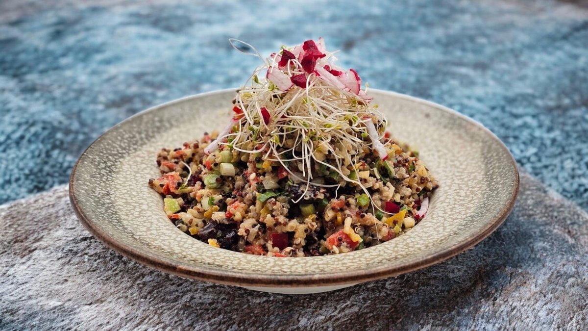 מיקס קינואה, תפוח עץ ירוק, בצל ירוק, נענע, פלפל גמבה ורוטב הבית