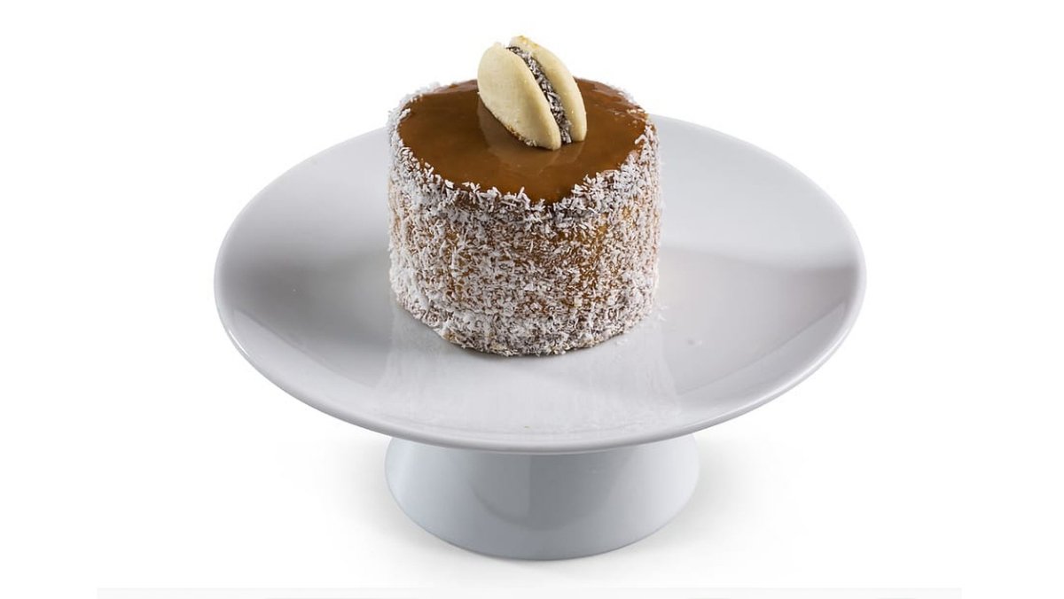 בסיס עוגיית אלפחורס גדולה, קרם ריבת חלב, ליבת קרם קוקוס, דקואז קוקוס, בציפוי גלא