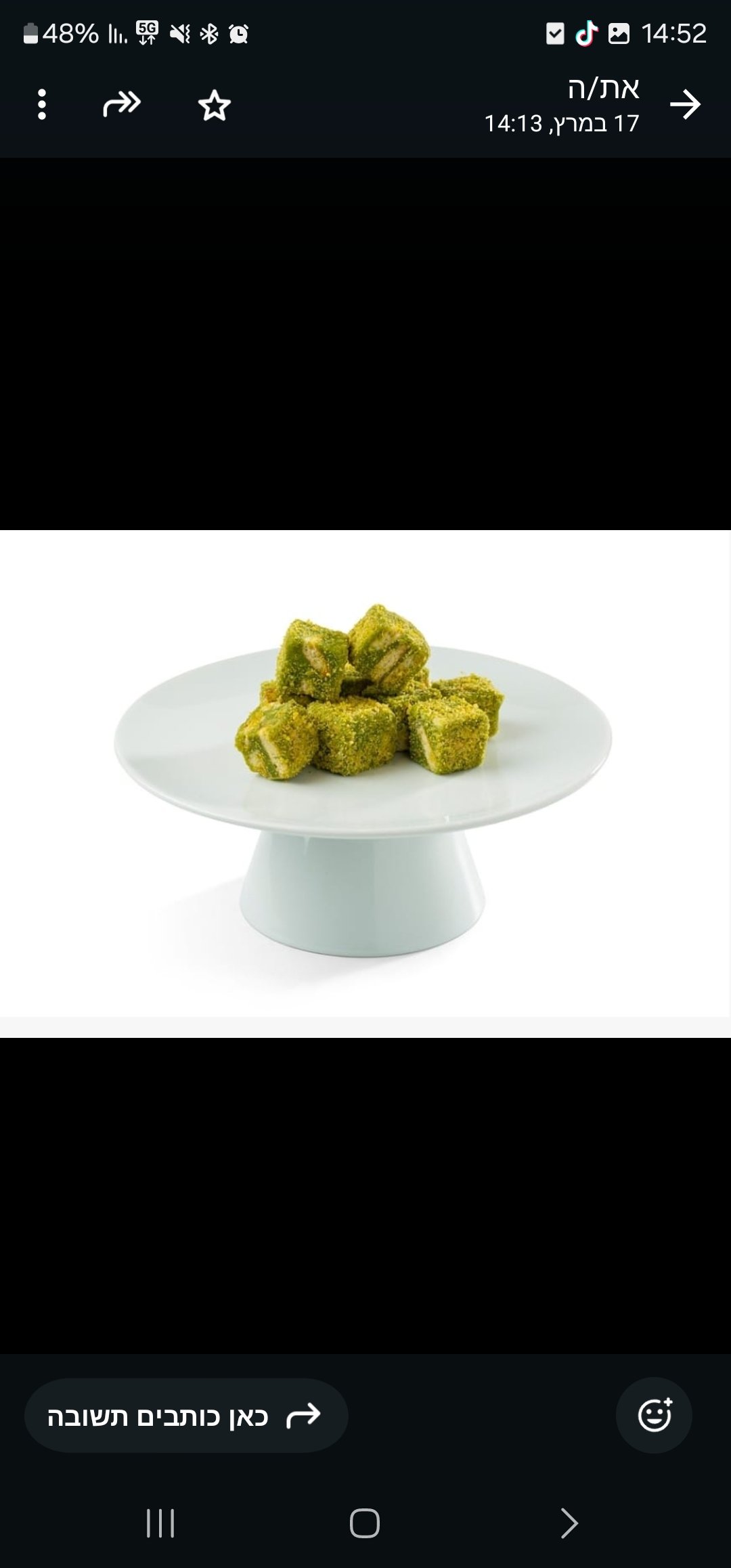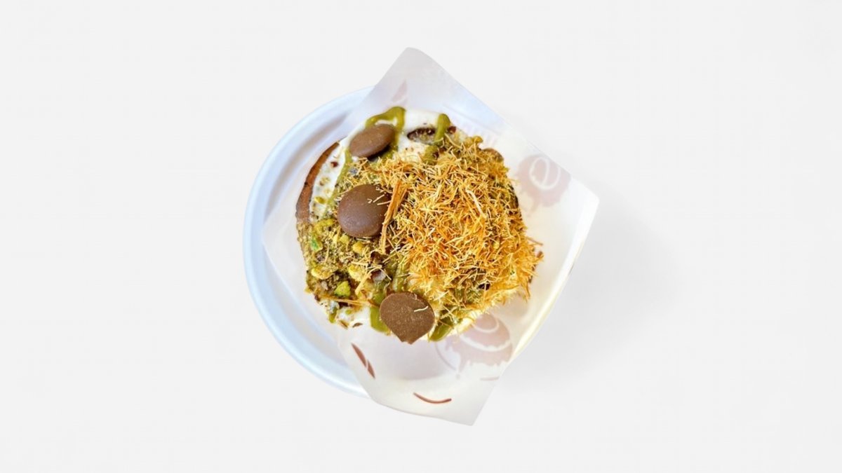 סינבון קרם שמנת רוטב פיסטוק מלא שבבי פיסטוק שערות כדאיף ופרלינים שוקולד חלב