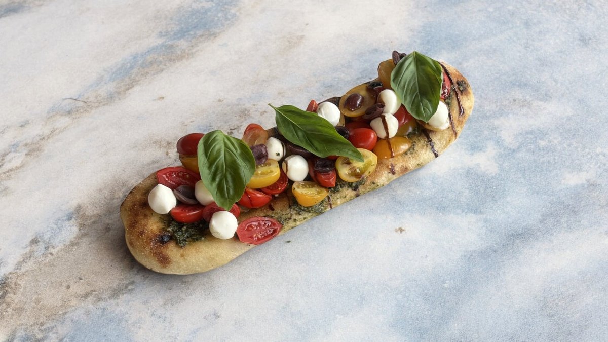 ממרח פסטו, עגבנייה, קרעי מוצרלה, עלי בזיליקום ובלסמי מצומצם