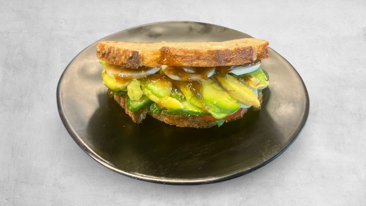 אבוקדו, עגבנייה, מלפפון, ביצה קשה ובצל מקורמל