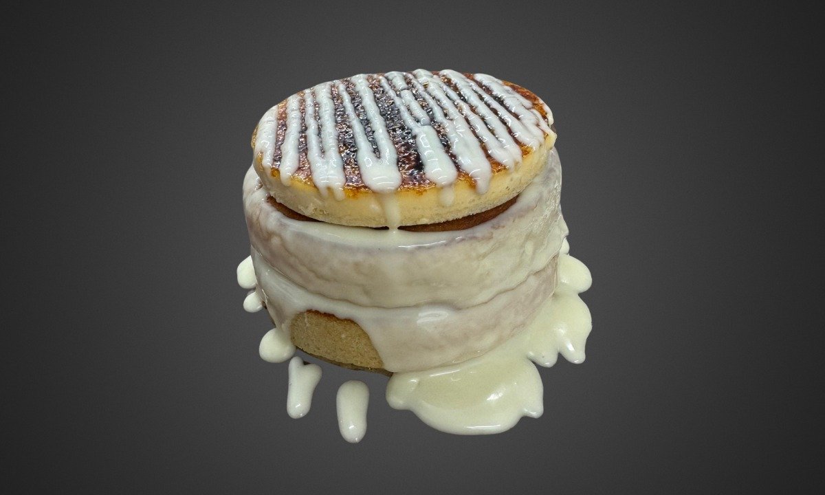 שתי יחידות פנקייק בציפוי רוטב לבן ודיסק ברולה חרוך
