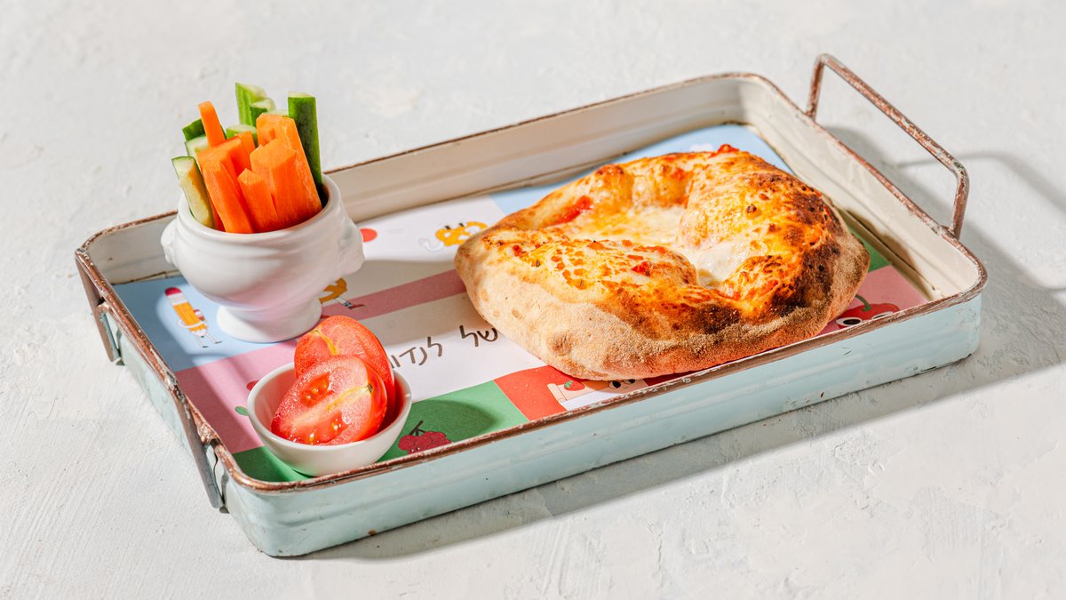 ברוטב עגבניות ומוצרלה, מוגשת עם ירקות טריים חתוכים