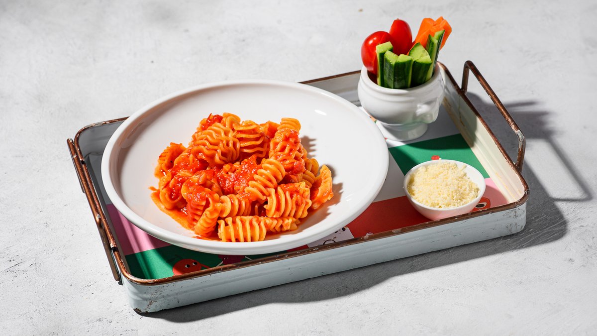 פסטה קונכיות קצרה עם רוטב עגבניות/רוזה/שמנת לבחירה. מוגשת עם ירקות טריים חתוכים.