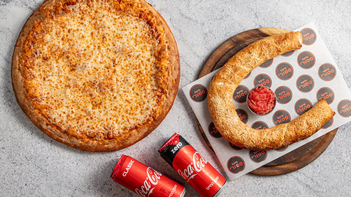 פיצה מוצרלה עם תוספת לבחירה, זיווה, ושתי פחיות שתיה