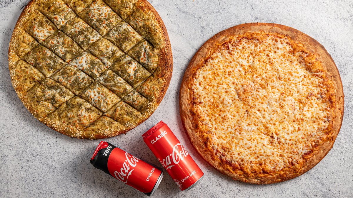 פיצה מוצרלה, לחם שום, שני רטבים לבחירה ושתי פחיות שתיה