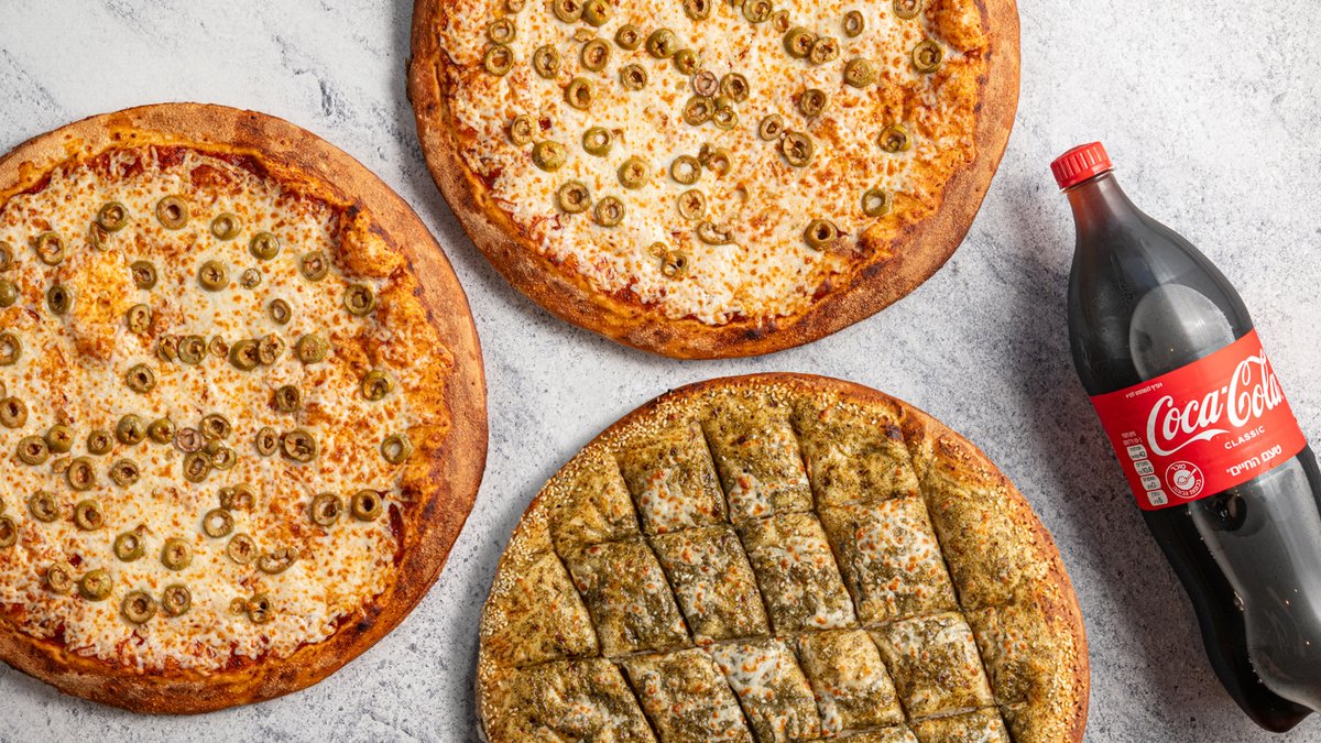 3 פיצות מוצרלה עם תוספת לבחירה ושתיה גדולה