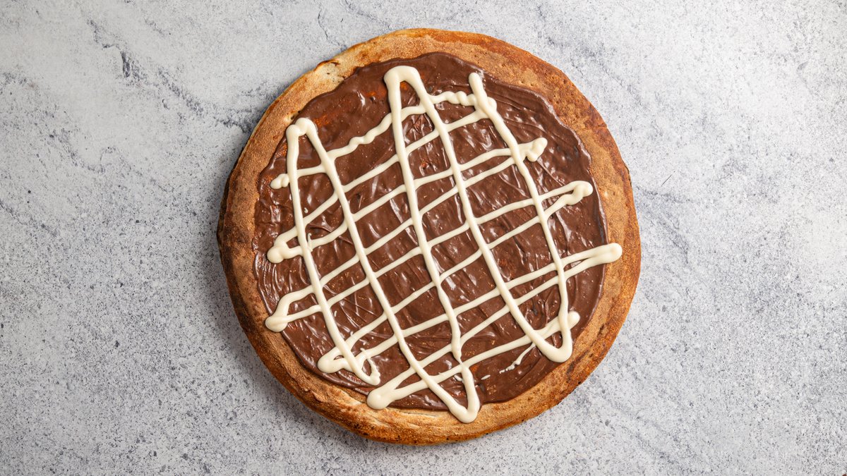 בצק פיצה עם ממרח שוקולד חום, שוקולד לבן ואבקת סוכר