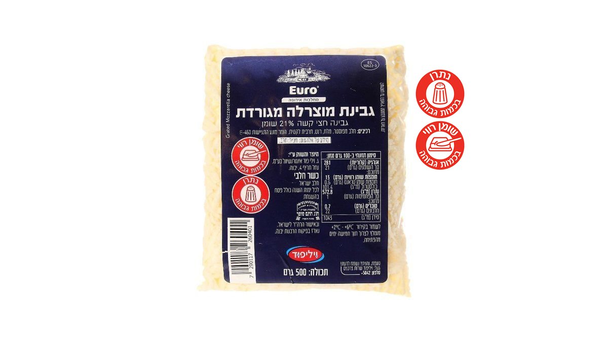 גבינת מוצרלה מגורדת 25% שומן 500 גרם יורו