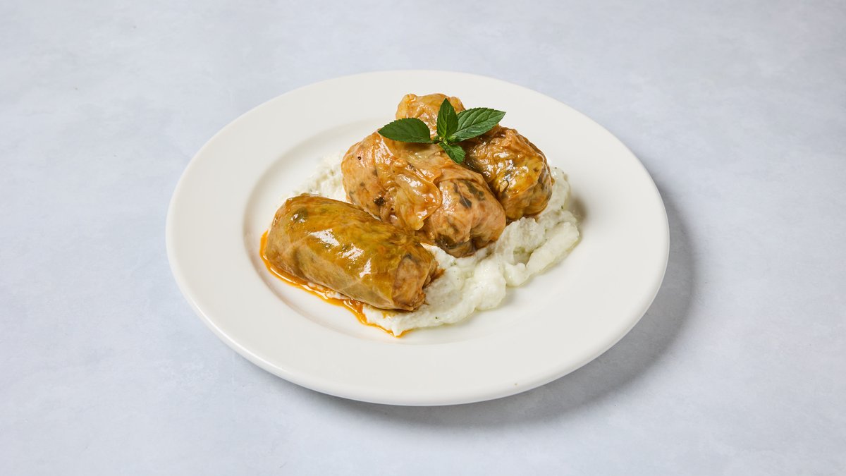 כרוב במילוי אורז ארומטי עם עשבי תיבול ורכז רימונים | 3 יח׳ מוגש עם ציזיקי טבעוני