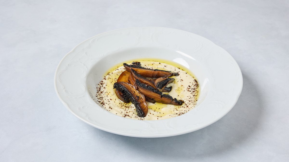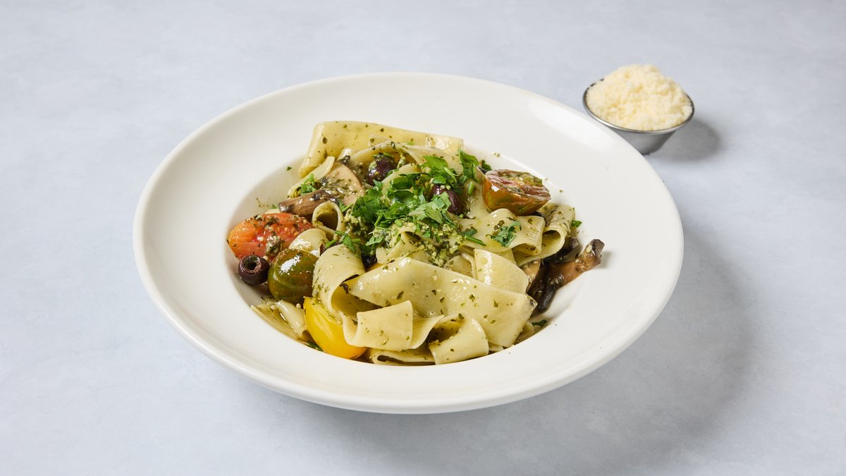 פפרדלה רחבה עם פטריות יער, עגבניות שרי, זוקיני וזיתי קלמטה ברוטב עשבי תיבול, קונפי שום ושמן זית