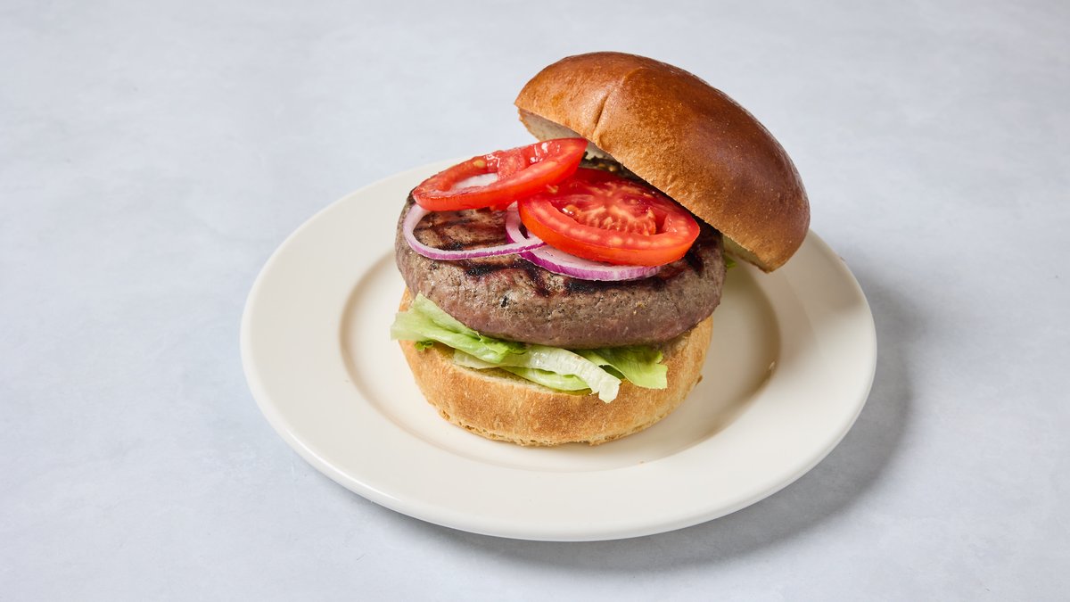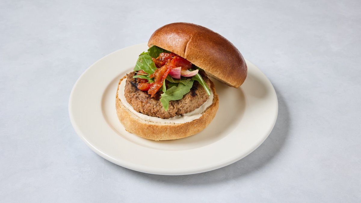 קציצה טבעונית בסגנון ים תיכוני עם טחינת הר ברכה, בצל, עגבנית בגריל ורוקט בלחמניה