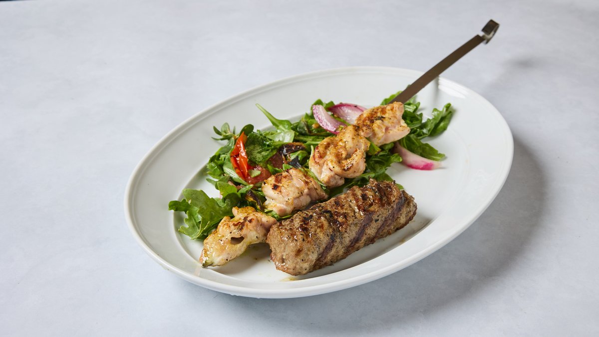 סטייק פרגית ושיפוד קבב מוגש עם תוספת לבחירה