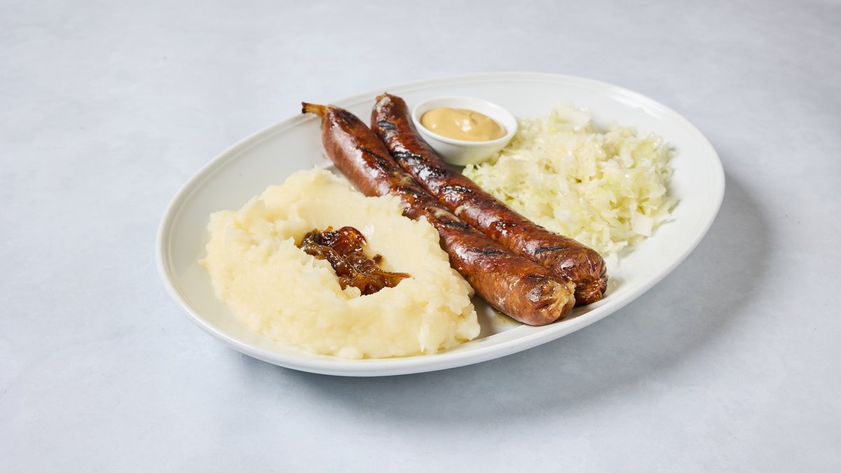 נקניקיה מנתחי בקר וטלה מוגש עם סלט כרוב, איולי חרדלי, ופירה עם בצל מטוגן