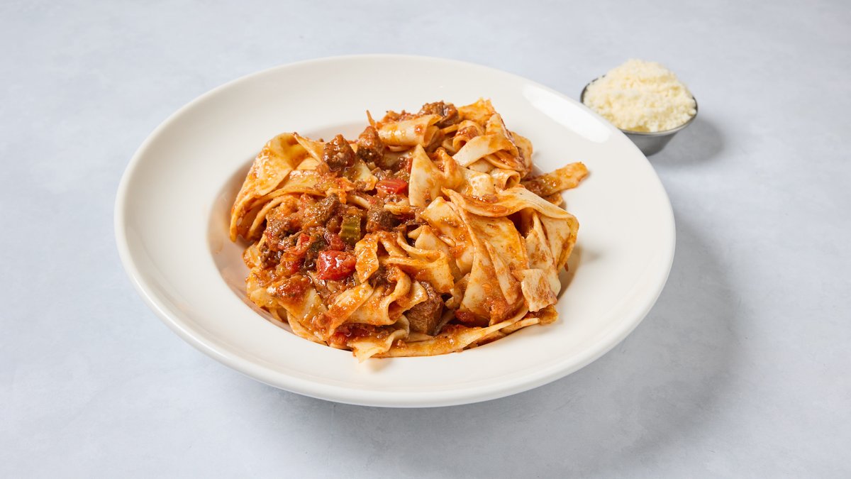 פפרדלה רחבה, תבשיל בשר בקר מפורק בבישול ארוך ורוטב עגבניות מוגש עם פרמז'ן טבעוני בצד