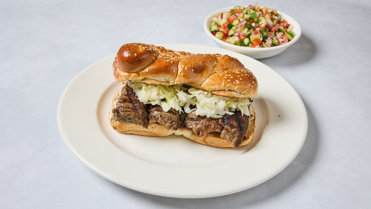 קבב רומני על הגריל עם כרוב וטחינה בחלה מוגש עם סלט אישי