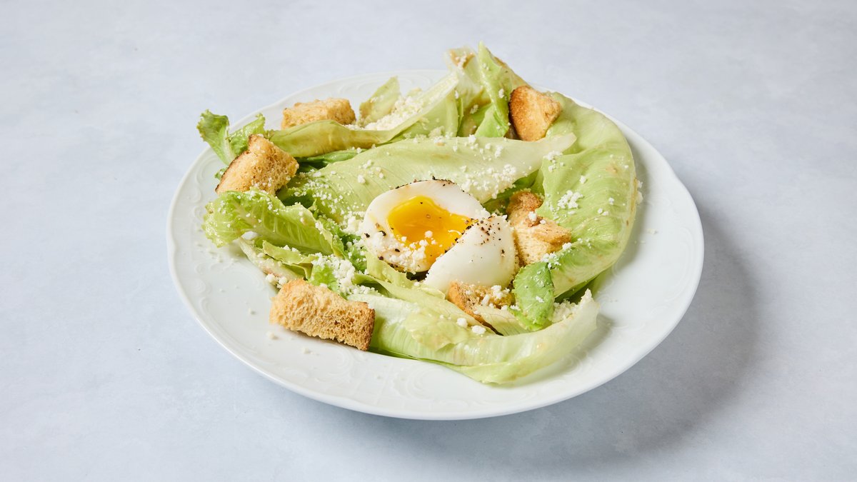 חסה, ביצה רכה, קרוטונים ופרמז׳ן טבעוני