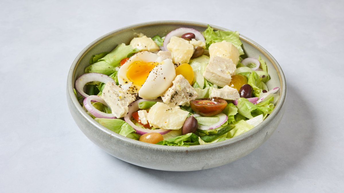 קונפי טונה ביתית, ביצה רכה, תערובת חסה ועלים, תפו"א, זיתי קלמטה, שעועית ירוקה, עגבניות, בצל סגול ואיולי לימונים כבושים