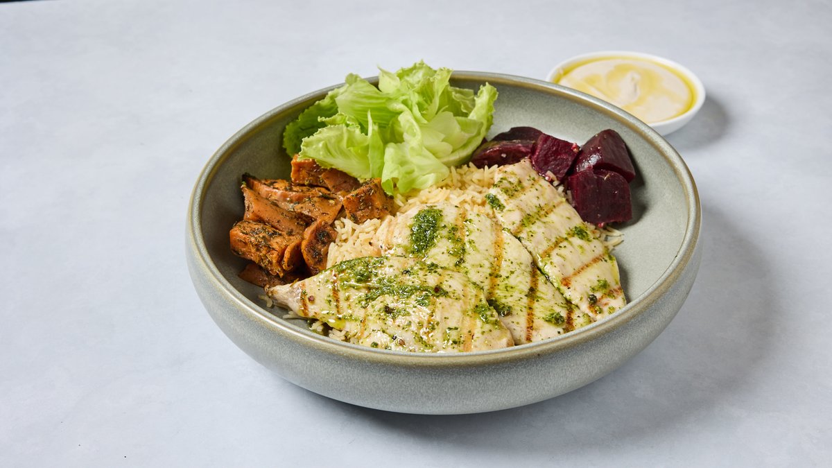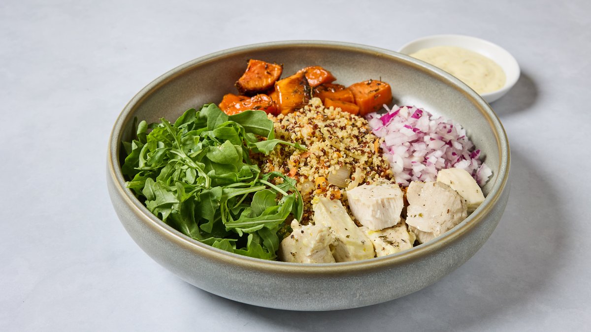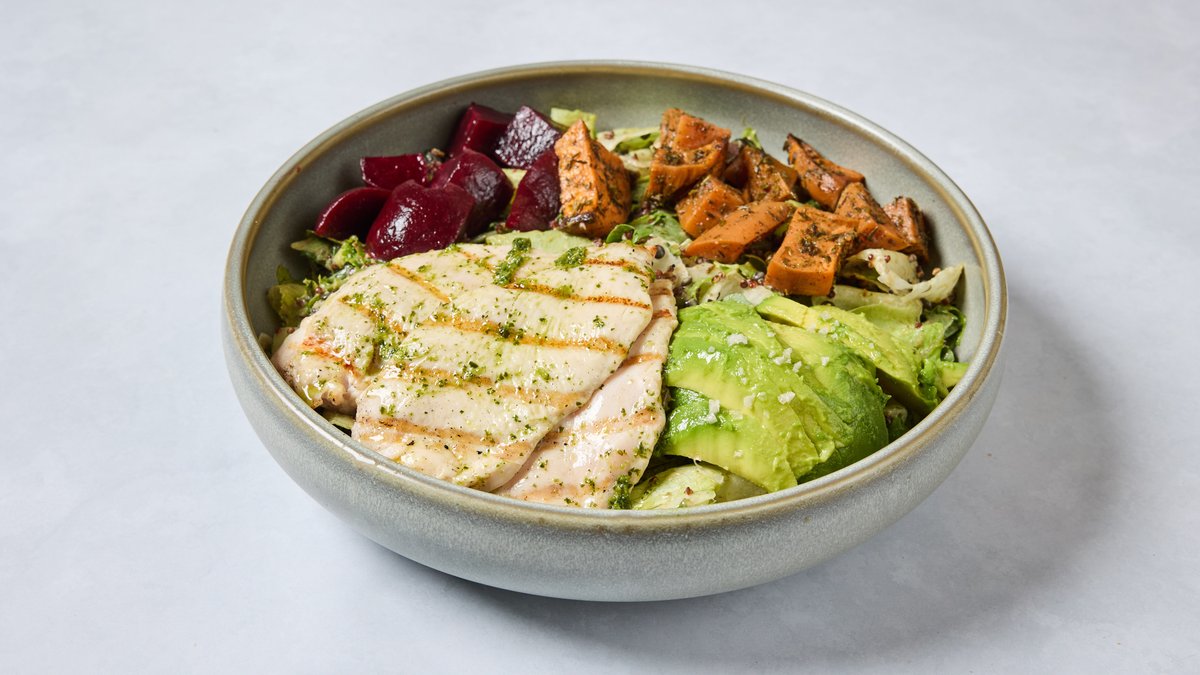 חזה עוף במרינדת עשבים קינואה ועדשים שחורות, אבוקדו, בטטה, סלק, חמוציות, אגוזי מלך וויניגרט תמרים