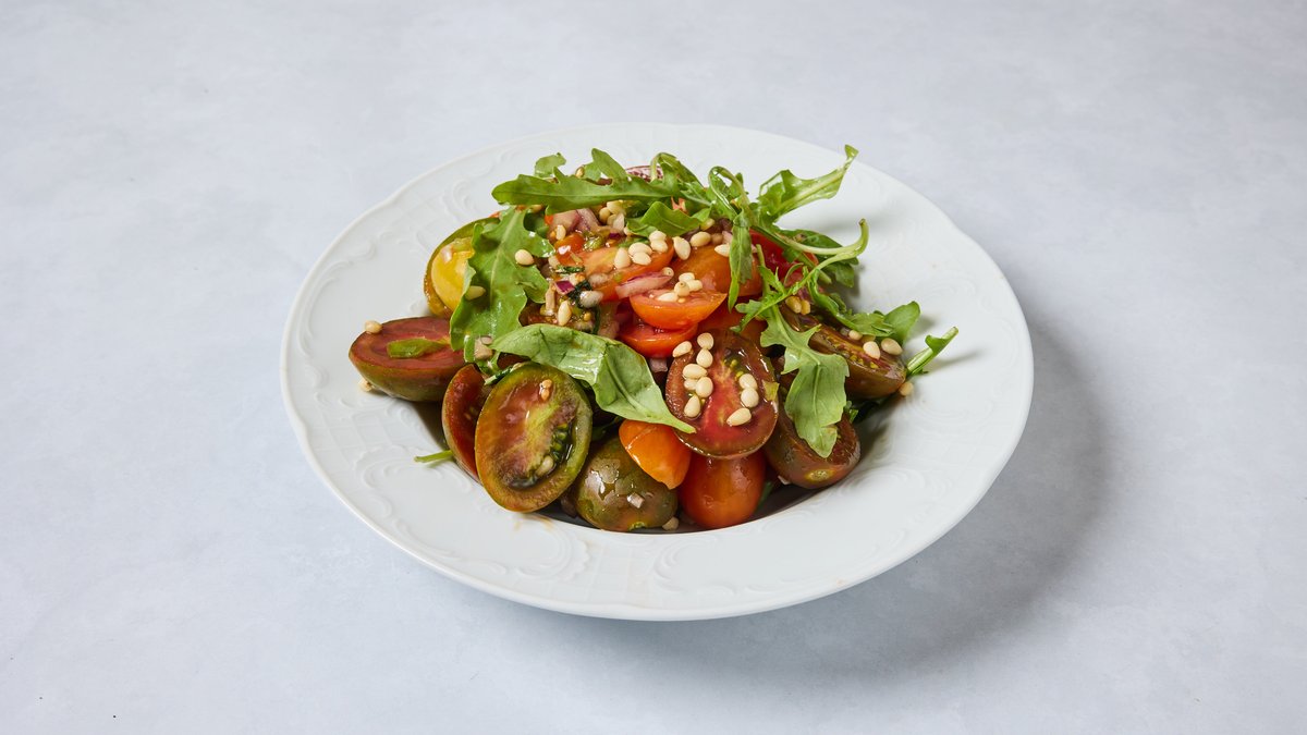 לקט עגבניות, עשבים טריים, בצל סגול, פלפל ירוק חריף ובלסמי