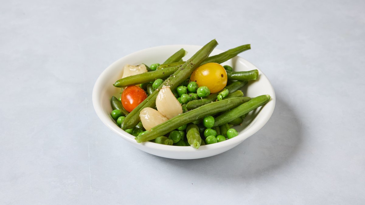 שעועית ירוקה, אפונה, עגבניות שרי צהובות, שום קונפי ושמן זית