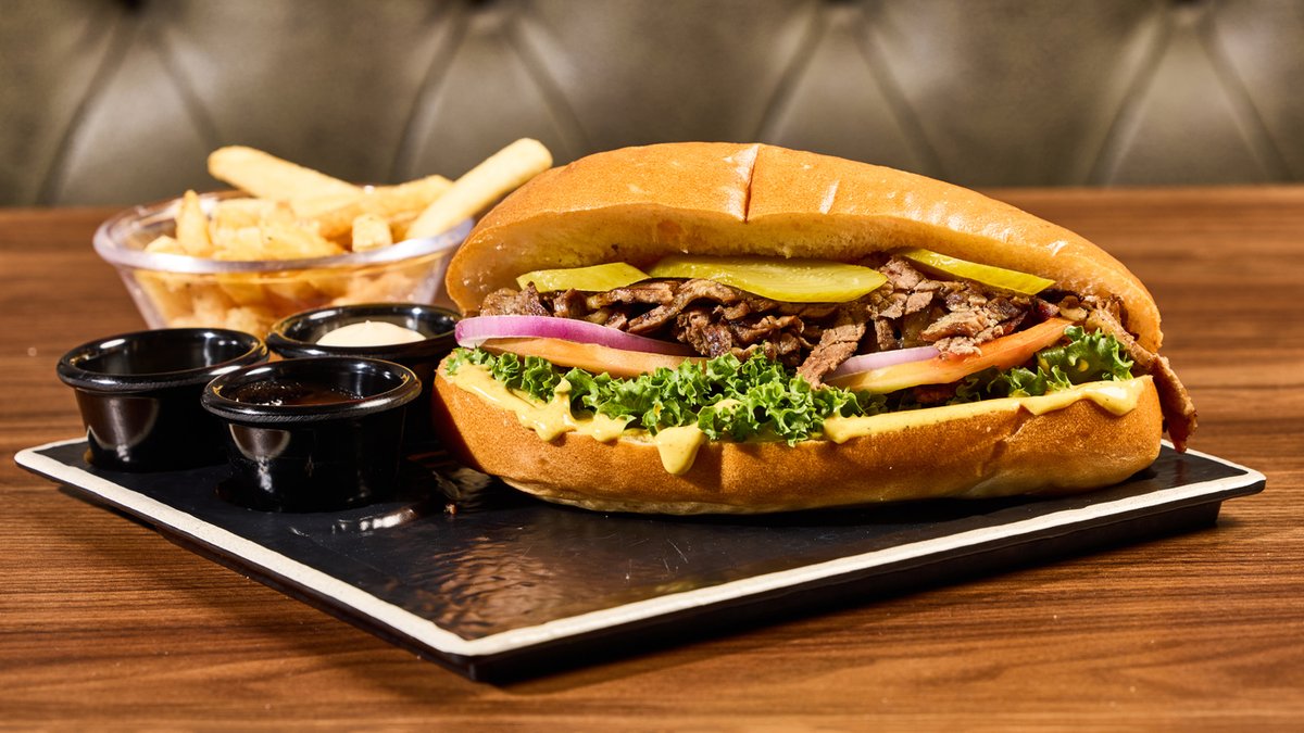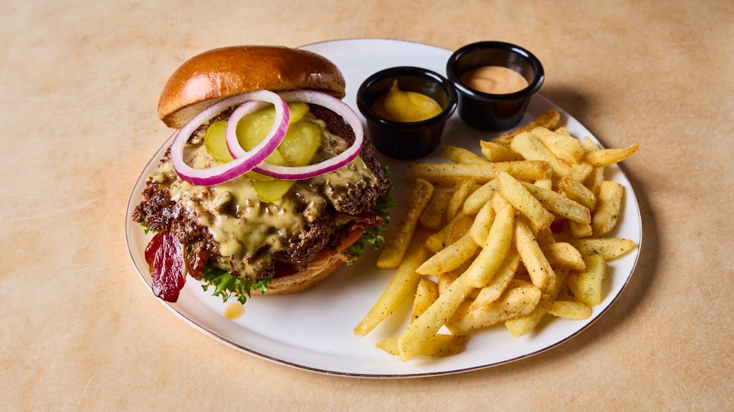 קצצת בשר טרי ,רוטב ניו יורק, בצל סגול, חסה, עגבניה ומלפפון חמוץ | בחרו משקל מוגש עם צ׳יפס ורטבים