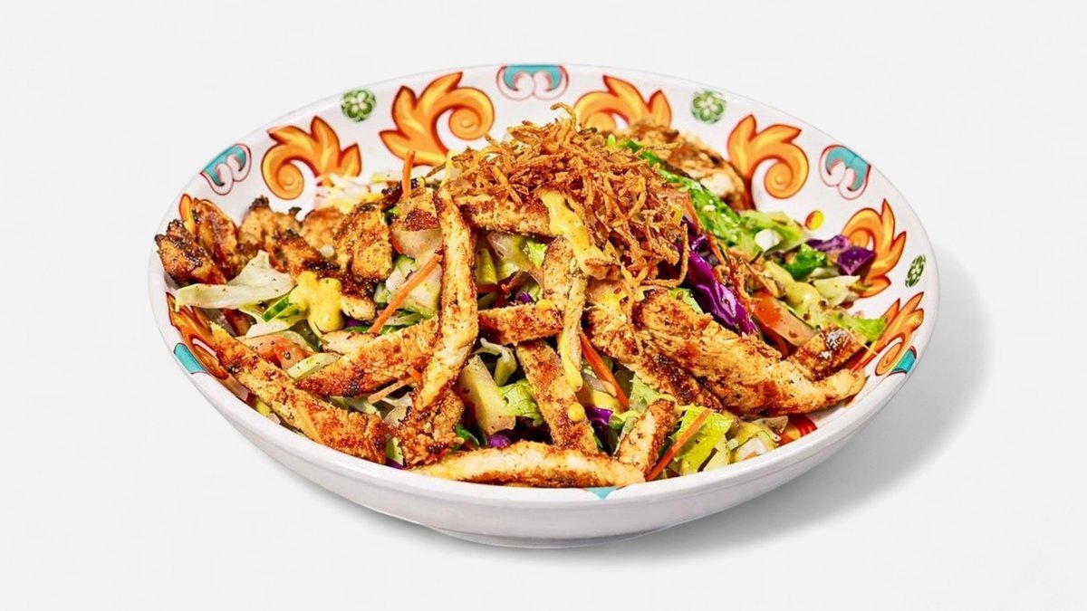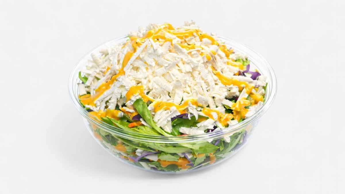 חסה, כרוב לבן, כרוב אדום, פלפלים צבעוניים, בצל סגול, נתחי חזה עוף, עגבניות שרי, מלפפון וגבינה בולגרית מגורדת, בתיבול שמן זית ולימון, רוטב הבית וקריספי גזר