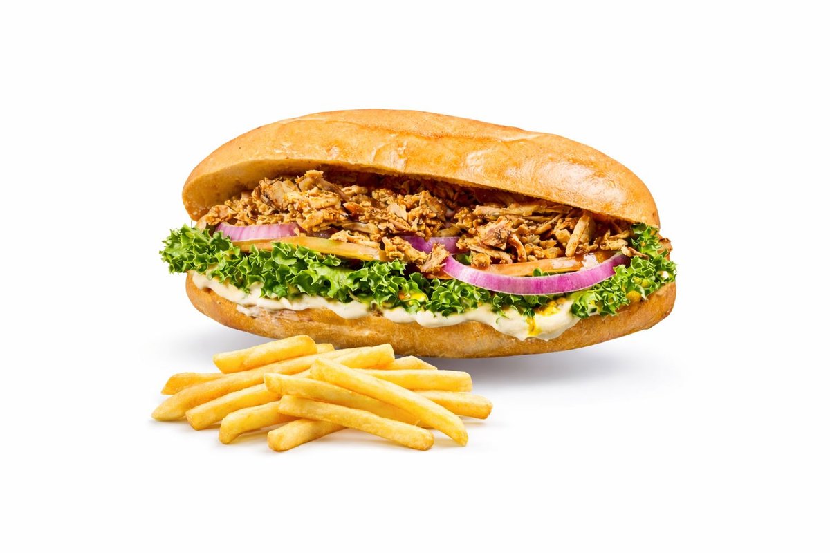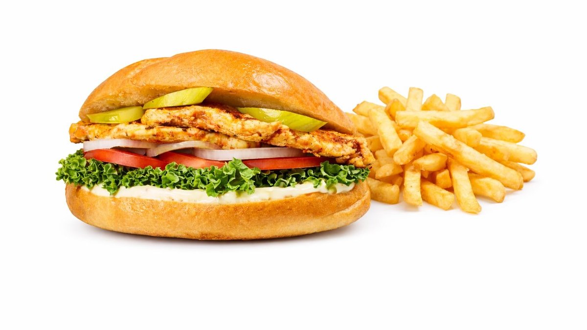 קציצה פריכה של פילה דג בלחמניה עם רוטב איולי לימון , חסה ומלפפון חמוץ מוגש עם צ׳יפס ורטבים מיונז-קטשופ-אלף האים