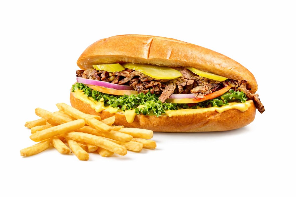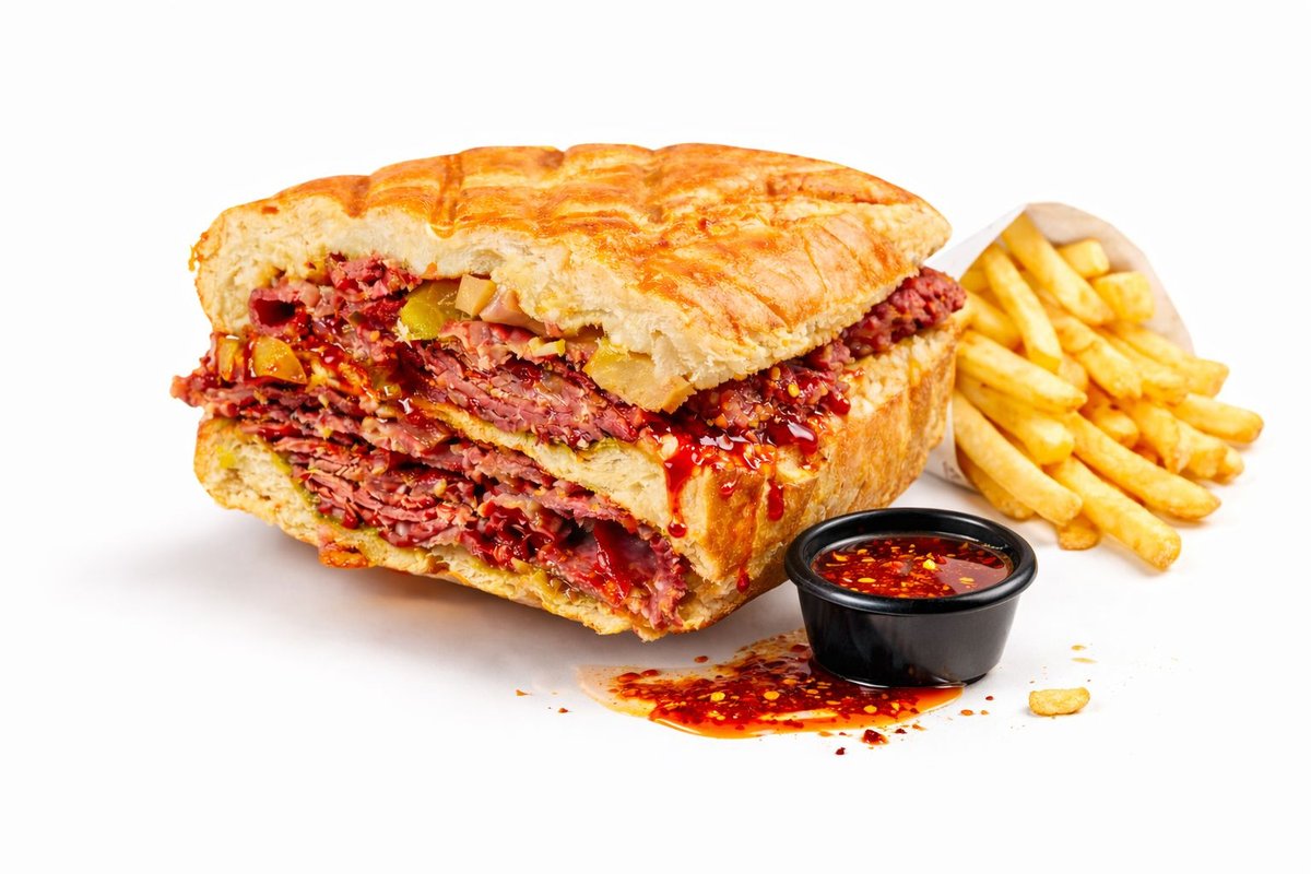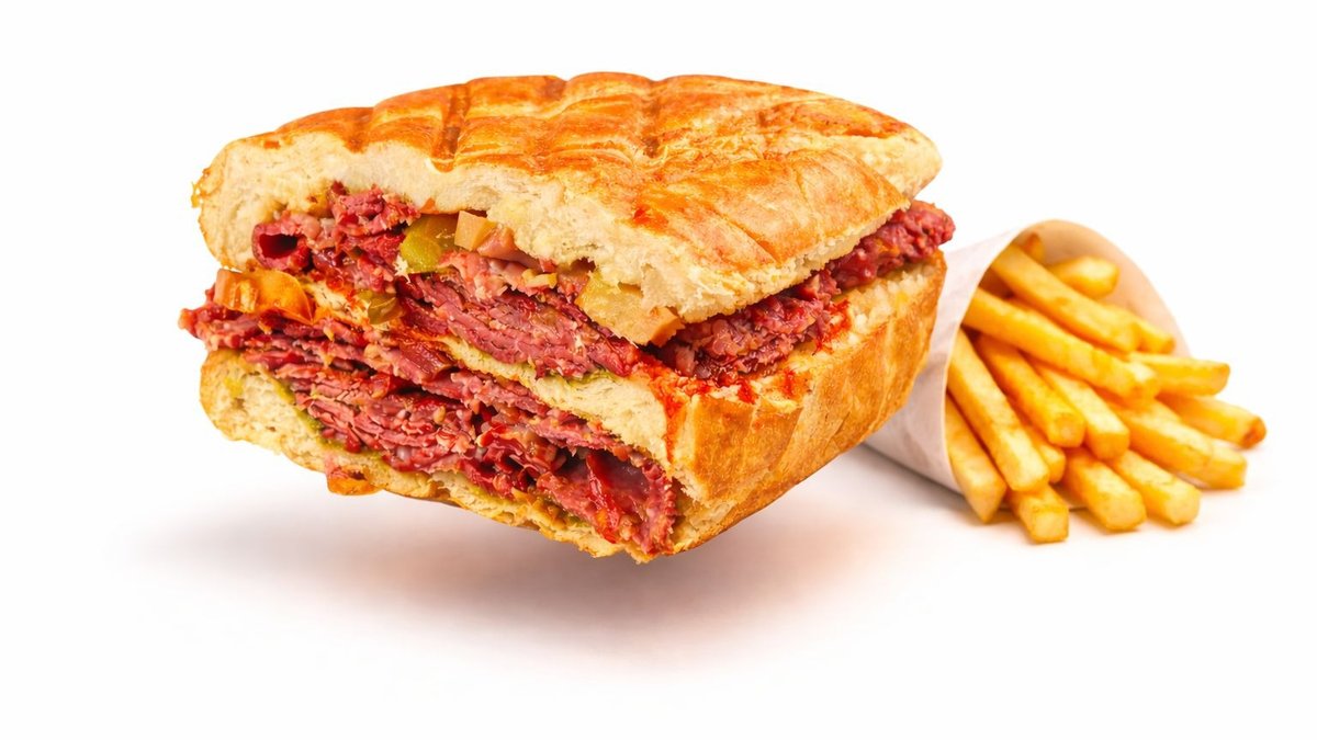 רוטב ניו יורק, בצל סגול, חסה, עגבניה, מלפפון חמוץ וגבינת צ׳דר | בחרו משקל מוגש עם צ׳יפס ורטבים מיונז-קטשופ-אלף האיים.