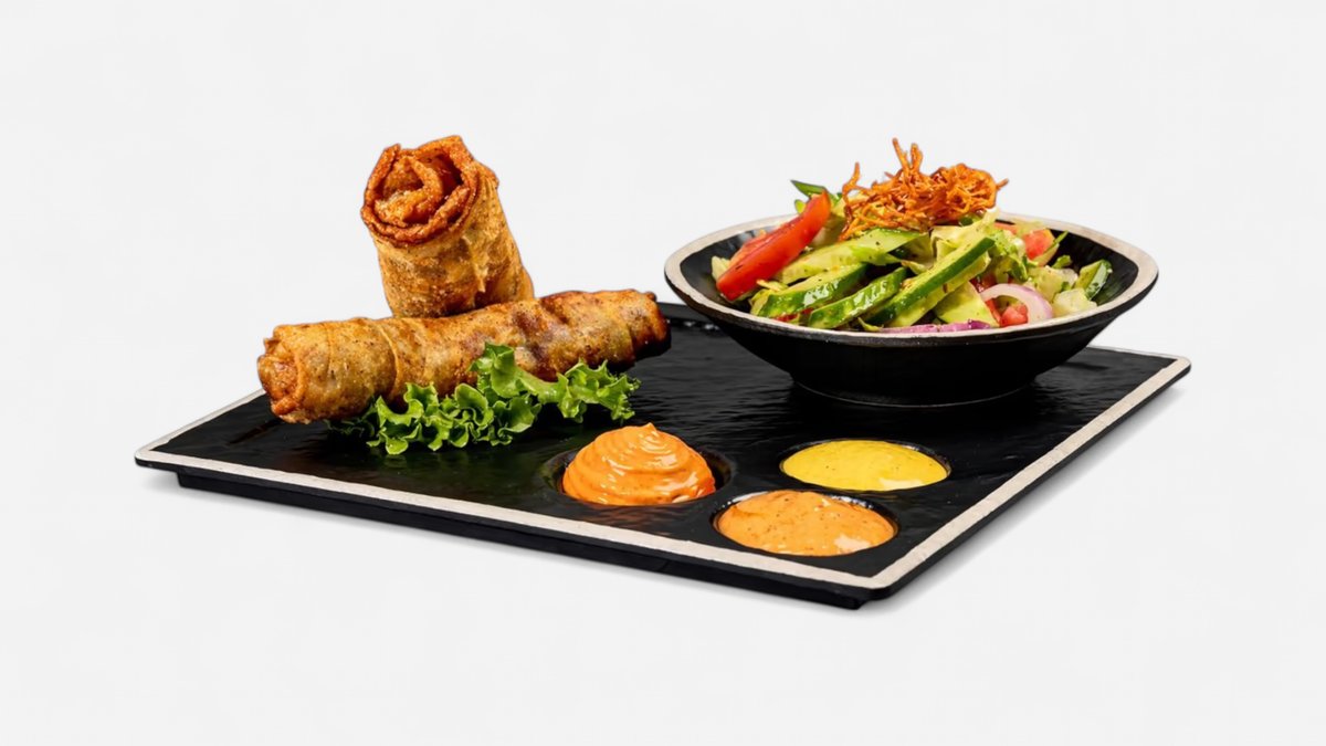 שני רולים קריספי עוף מתובל עם צנובר (מהמטבח הערבי) מוגש עם סלט אישי אותנטי
