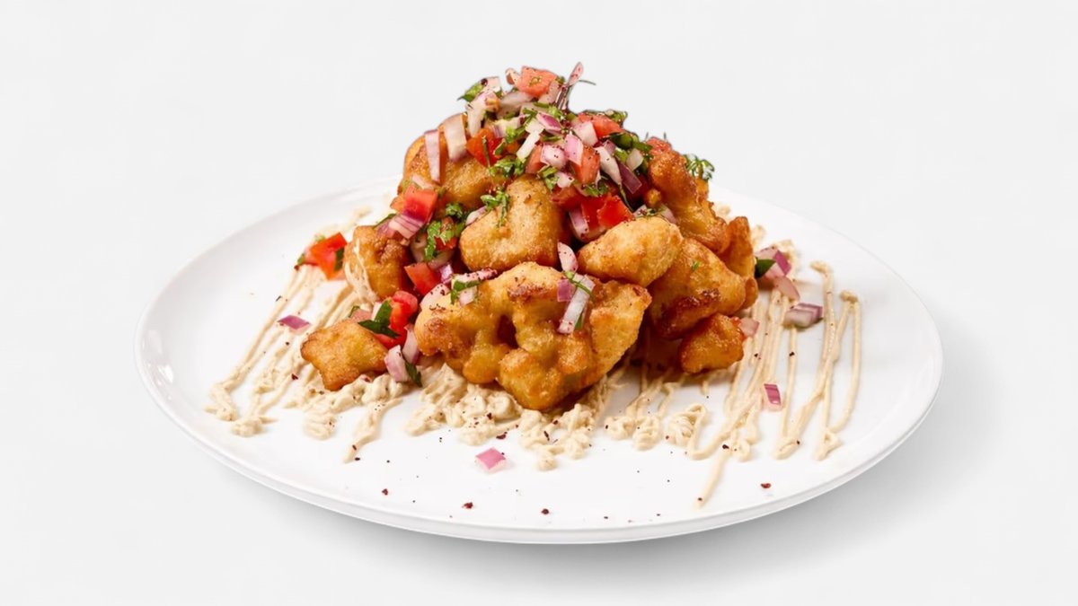 כרובית על מצע טחינה, מעל סלט הבית, עגבניה קצוצה, בצל קצוץ ופטרוזיליה