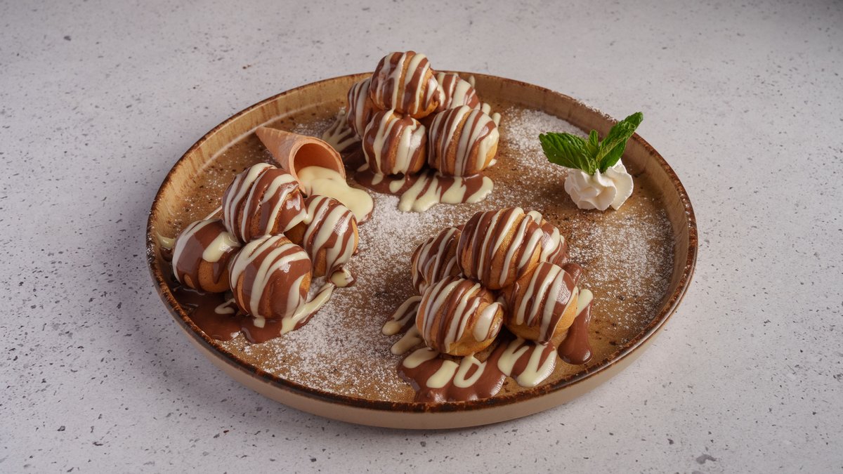 מוגש עם שוקולד חום ושוקולד לבן يقدم مع شوكولاتة بنية وشوكولاتة بيضاء