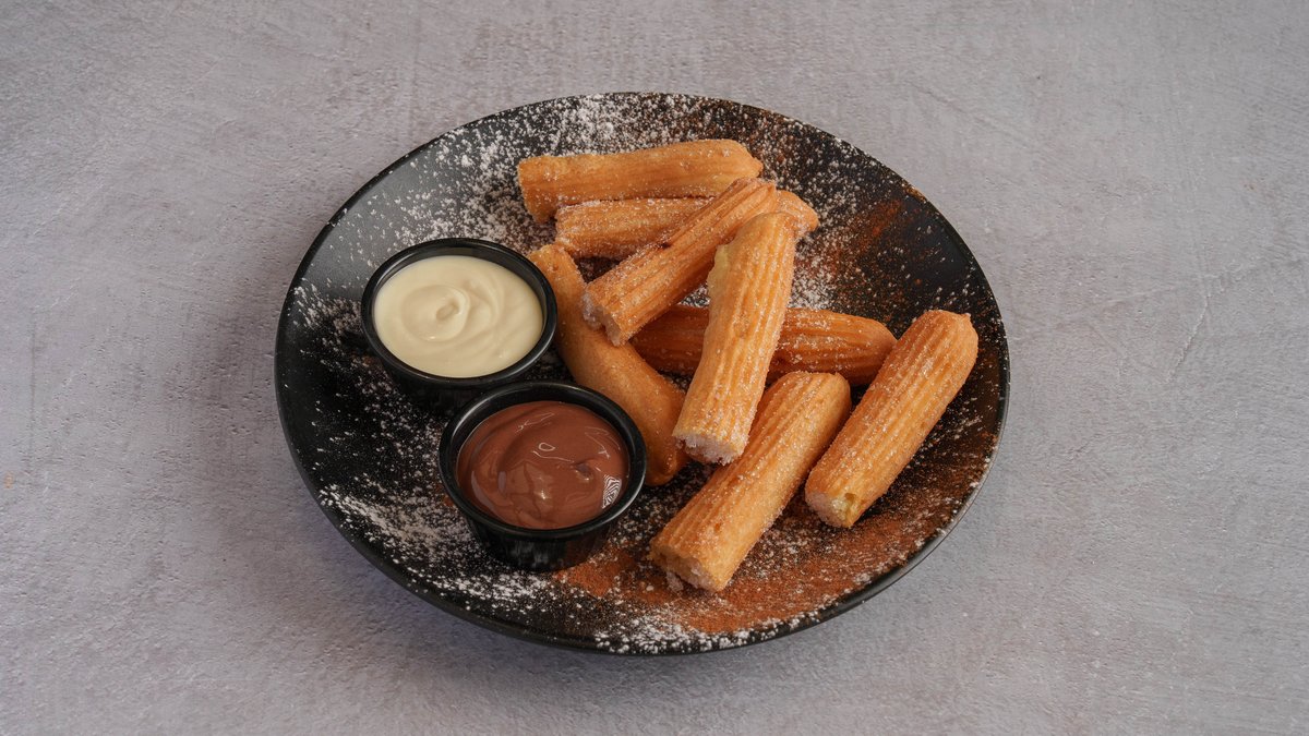 10 יח׳ צ׳ורוס חמים, פריכים מבפנים וזהובים מבחוץ, מצופים בסוכר וקינמון לצד ממרח נוטלה ושוקולד לבן נמס מוגש עם תוספות ורטבים לבחירה