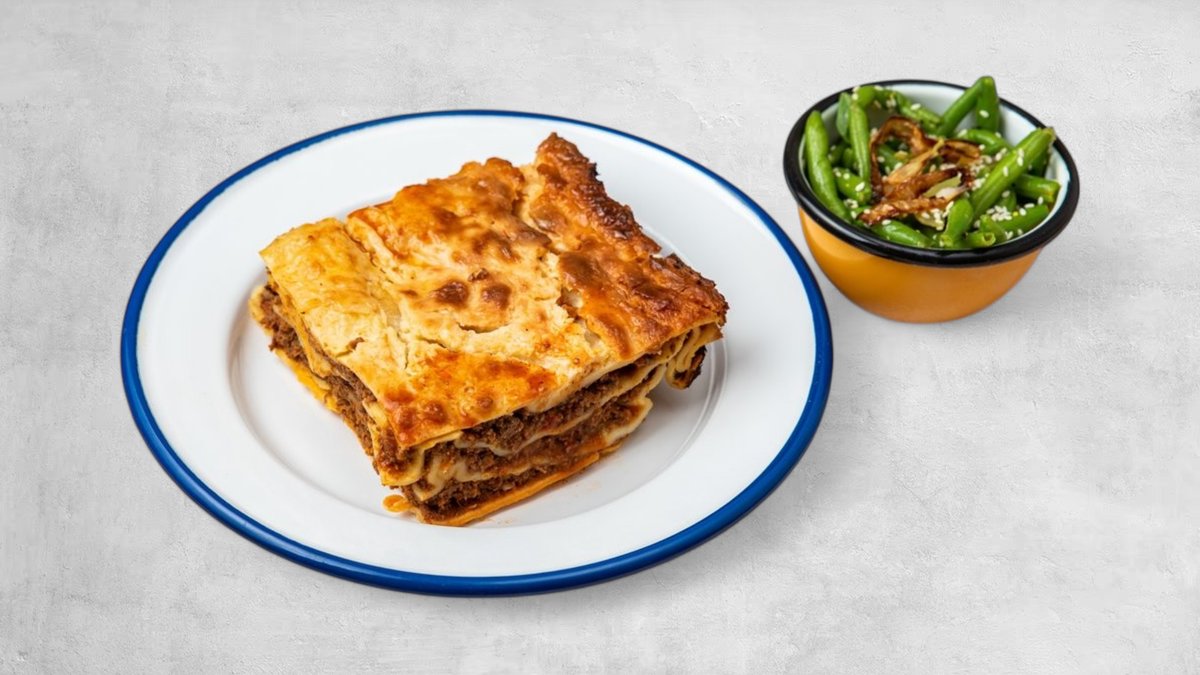 שכבות דפי לזניה עם בשר צלעות בקר טחון בבישול ארוך עם פטריות ובצל