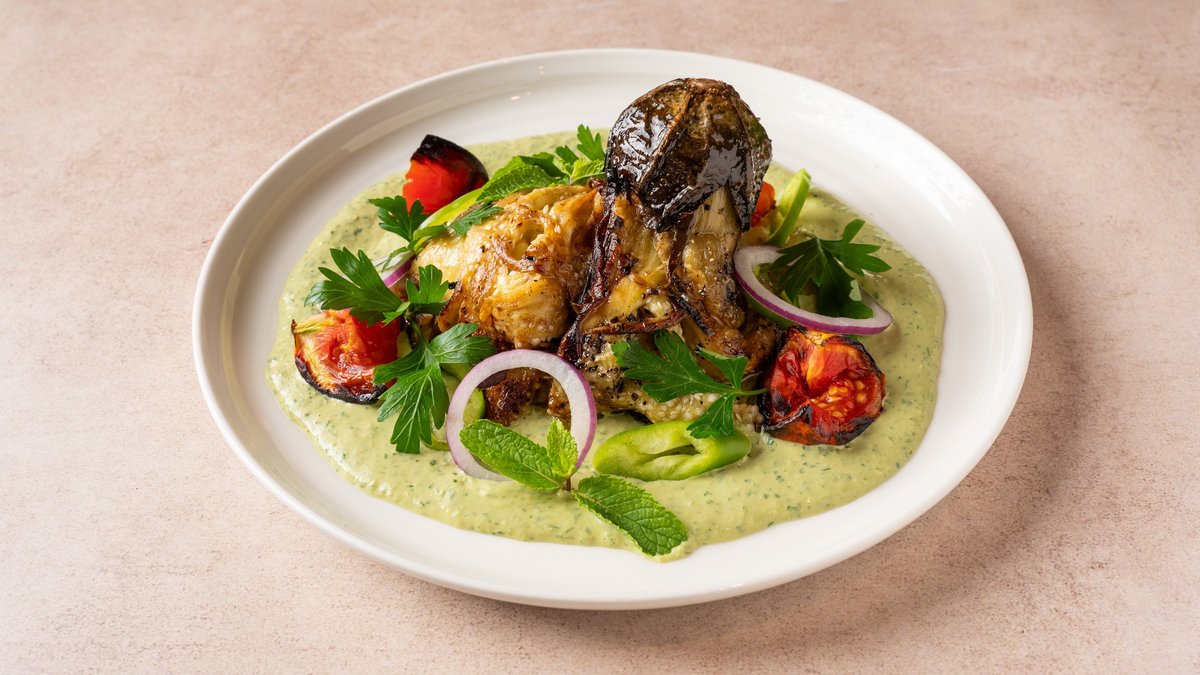 טחינה שחורה, עגבניות מהגריל, בצל סגול, פלפל חריף, שמן זית, צנונית ופטרוזיליה מוגש עם פיתה