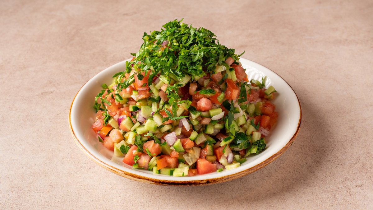 מלפפון, עגבנייה, בצל סגול, פטרוזיליה, שמן זית, מיץ לימון וטחינה מוגש עם פיתה, טחינה ורטבים