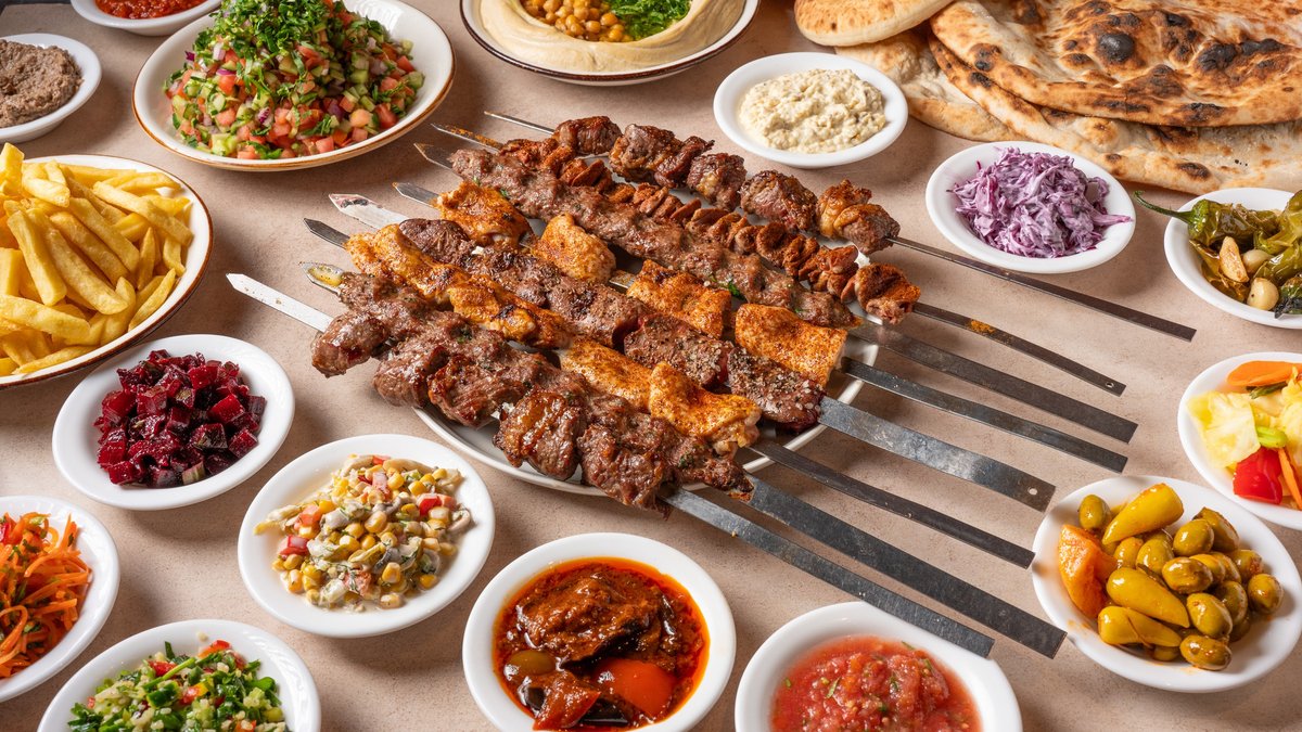 12 סוגי סלט כ-150 גרם כל סלט, חומוס גרגירים, 2 תוספות גדולות לבחירה, 6 פיתות, 8 שיפודים לבחירה