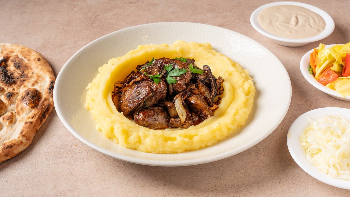 כבד עוף מוקפץ עם בצל מטוגן ושמן זית מוגש על תוספת פירה