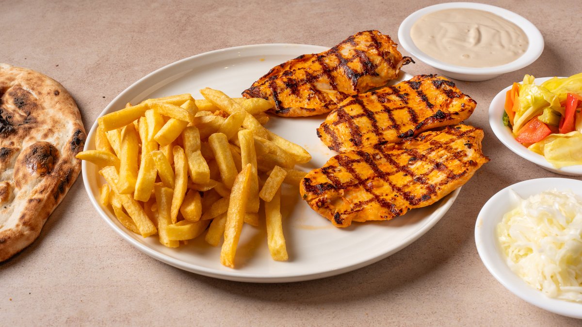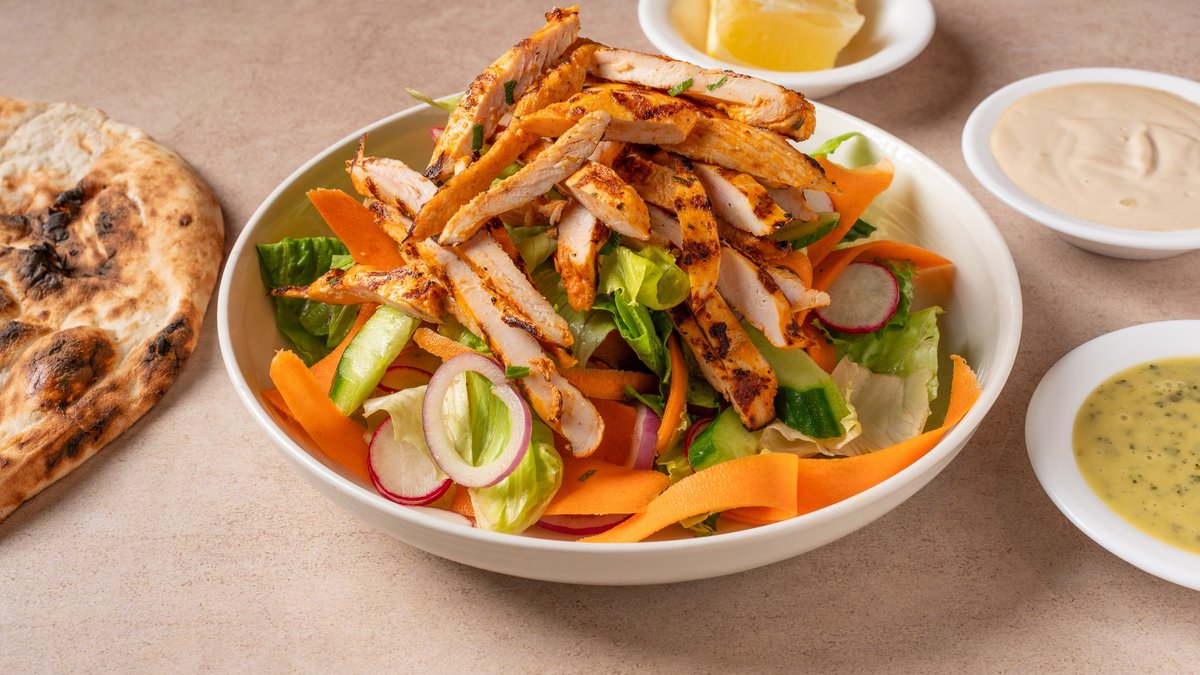מוגש עם תוספת חמה לבחירה, סלטי הבית ופיתה