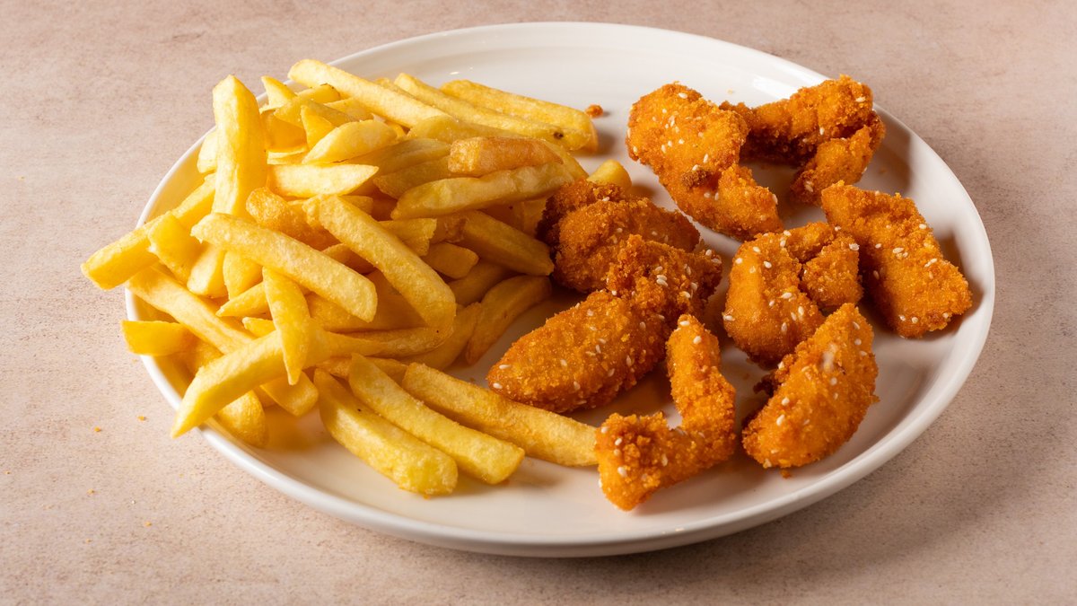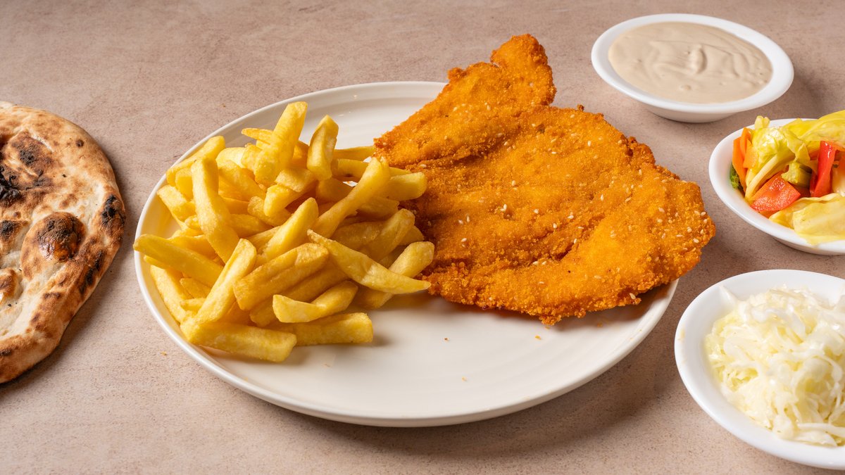 חזה עוף פרוס במעטפת פירורי לחם זהובים ומעט שומשום מוגש עם תוספת לבחירה