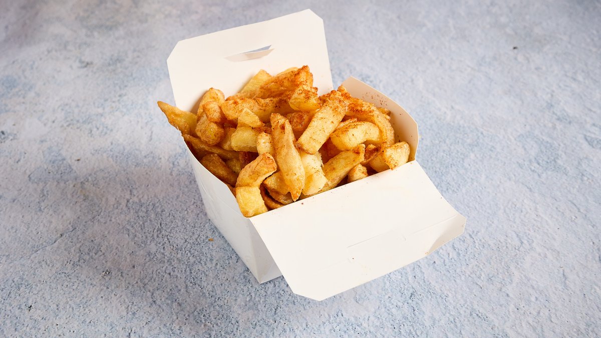המנות מוגשות עם צ׳יפס ושתי קופסאות חמוצים
