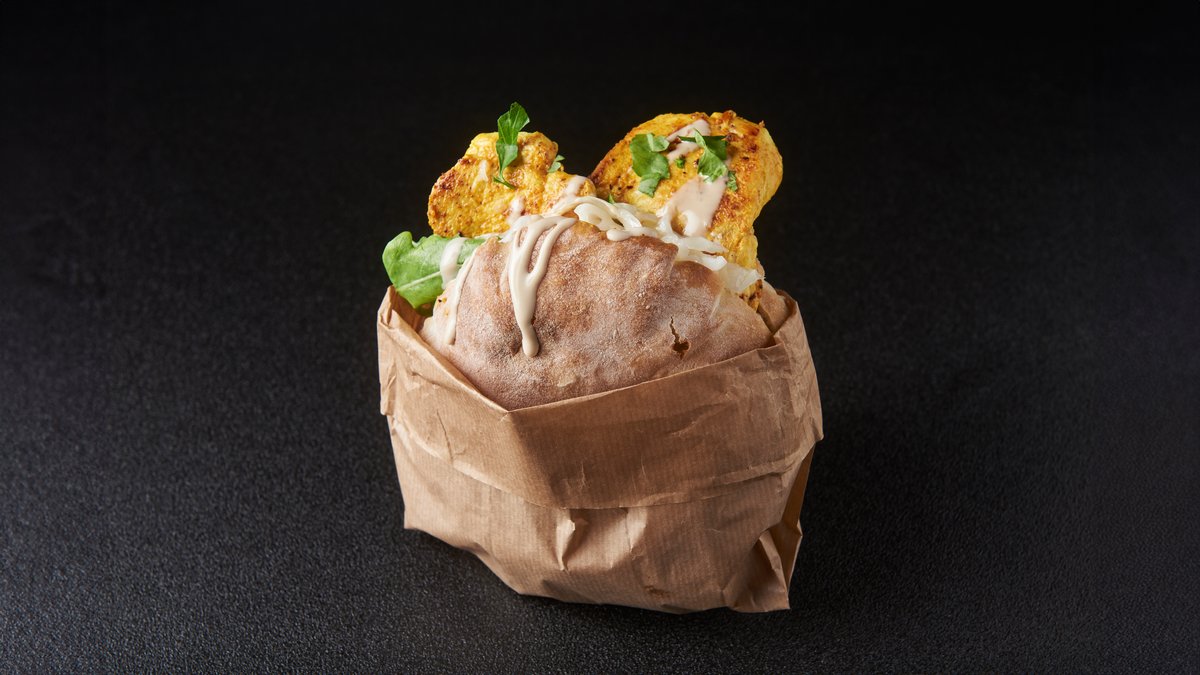 חלת חזה עוף עם טחינה, עגבנייה, חסה, מלפפון חמוץ ופלפל חריף קצוץ מוגש עם תוספת ושתייה לבחירה