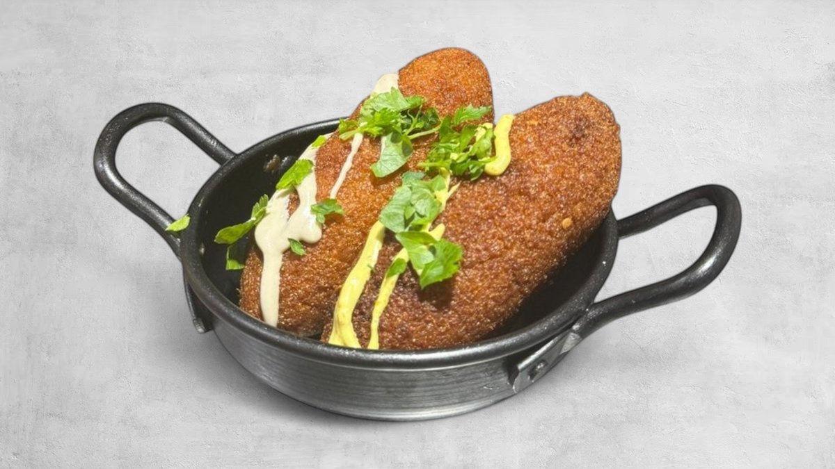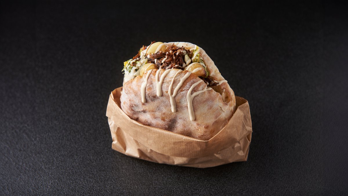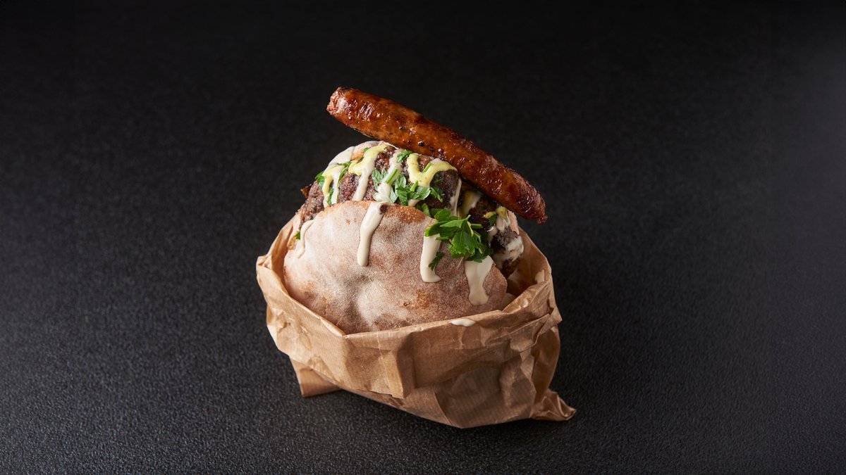 ביצה קשה, חציל מטוגן, איולי עמבה, תפוצ׳יפס קראנץ׳, פלפל חריף קצוץ, אורגולה, בצל מוחמץ וטחינה