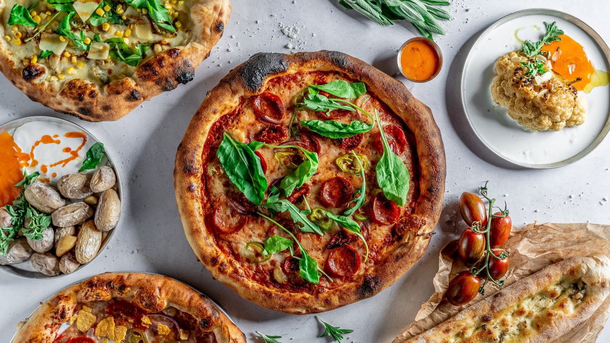 פיצה עם רוטב עגבניות, מוצרלה, קורנביף ניו יורק, סלסת עגבניות, שום קונפי, בצל מקורמל ווינגרט שרי