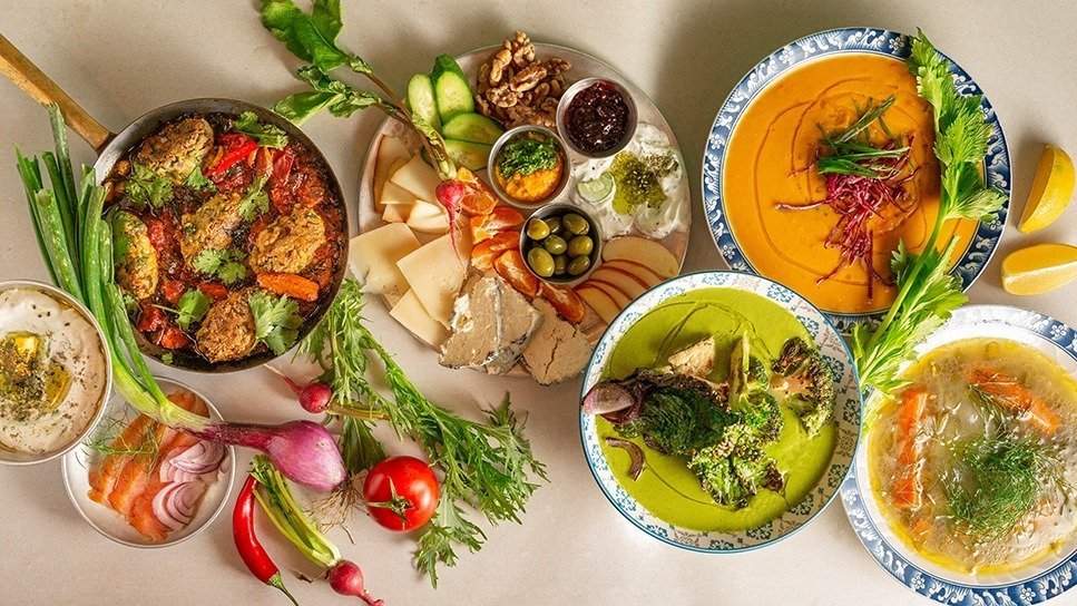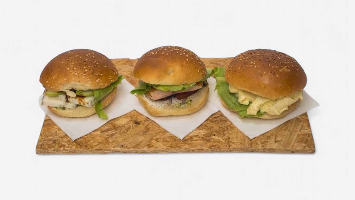 חביתה רכה, צזיקי, ממרח גזר ושום, פסטו, שרי, בצל צלוי, מלפפון ועלים לחם מחמצת ובשישי יוצא עם חלה